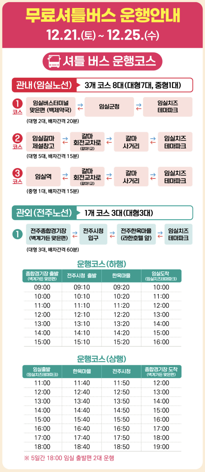 특히, 전주-임실 간 셔틀버스를 운행하여 방문객들의 편의를 더욱 높였습니다. 전주종합경기장-전주시청-한옥마을-임실치즈테마파크(축제장)를 순회하는 노선으로, 오전 9시부터 1시간 간격으로 운행됩니다. 자가용 없이도 편리하게 축제장을 방문할 수 있으니, 교통 걱정은 없겠죠?