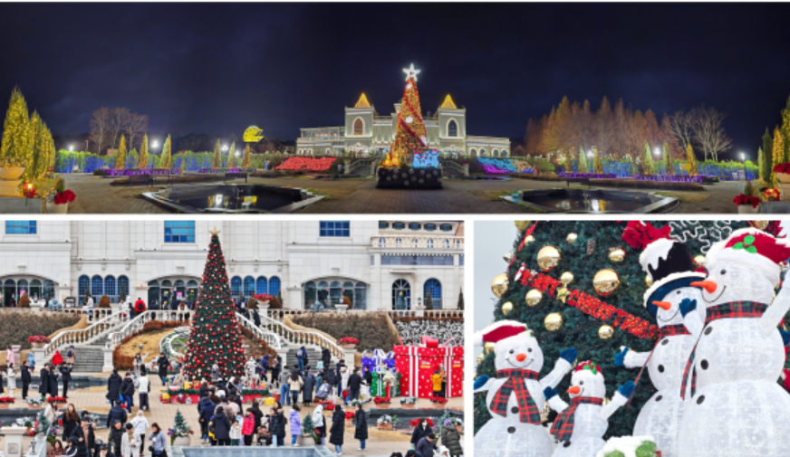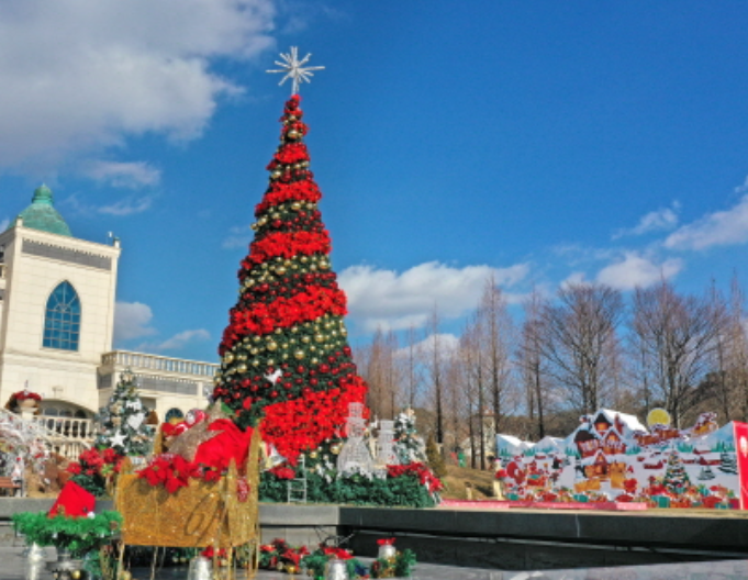트리 주변에는 눈사람, 루돌프, 산타 등 겨울 테마의 다양한 조형물과 반짝이는 포인세티아 장식으로 꾸며진 포토존이 마련되어 있습니다. 사랑하는 사람들과 아름다운 겨울 풍경을 배경으로 사진을 찍으며 소중한 추억을 남겨보세요.