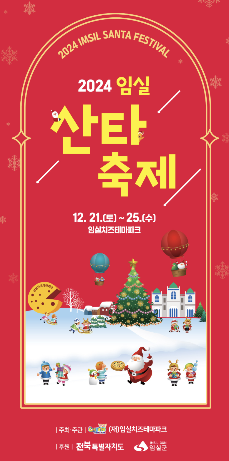 크리스마스, 사랑하는 가족과 잊지 못할 추억을 만들고 싶다면, 전라북도 임실군으로 오세요! 2024년 12월 21일부터 25일까지, 5일간 임실치즈테마파크에서 "2024 임실산타축제"가 펼쳐집니다! 올해는 더욱 업그레이드된 프로그램과 편의시설로 여러분을 맞이할 준비를 마쳤습니다. 설렘 가득한 축제 현장으로 지금 바로 떠나볼까요?!